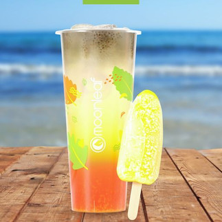 Bright and citrusy sparkling passion fruit tea with chia seeds, paired with a tropical mango popsicle